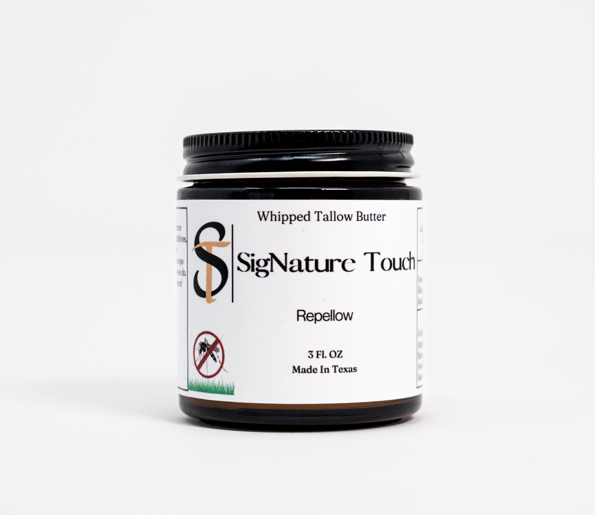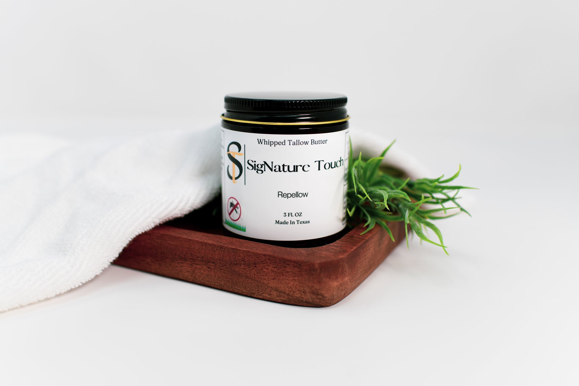 SigNature Touch's Repellow Tallow Body Butter edition. Repellow is handcrafted with Organic Lavender, Lemon, Citronella, & Eucalyptus Essential Oil to provide your skin with protection against insects. Repellow is a natural repellent formulated to ward off mosquitoes, flys, ants, etc.